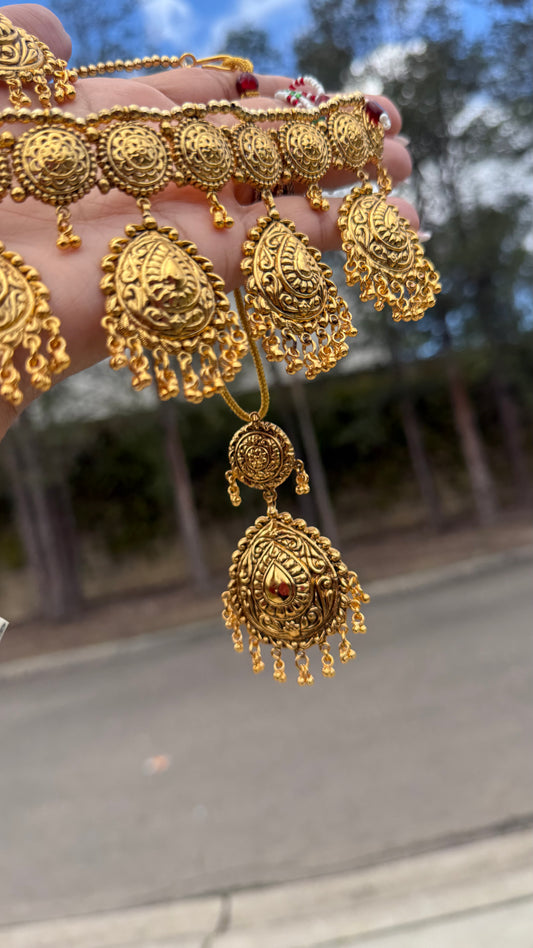 Gold Plated Indian Choker Set with Earrings & Tikka – Bridal Jewelry Sandookh collection