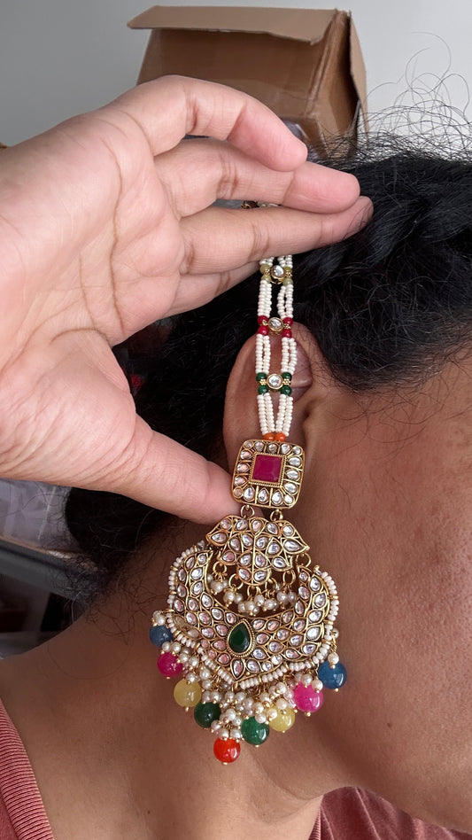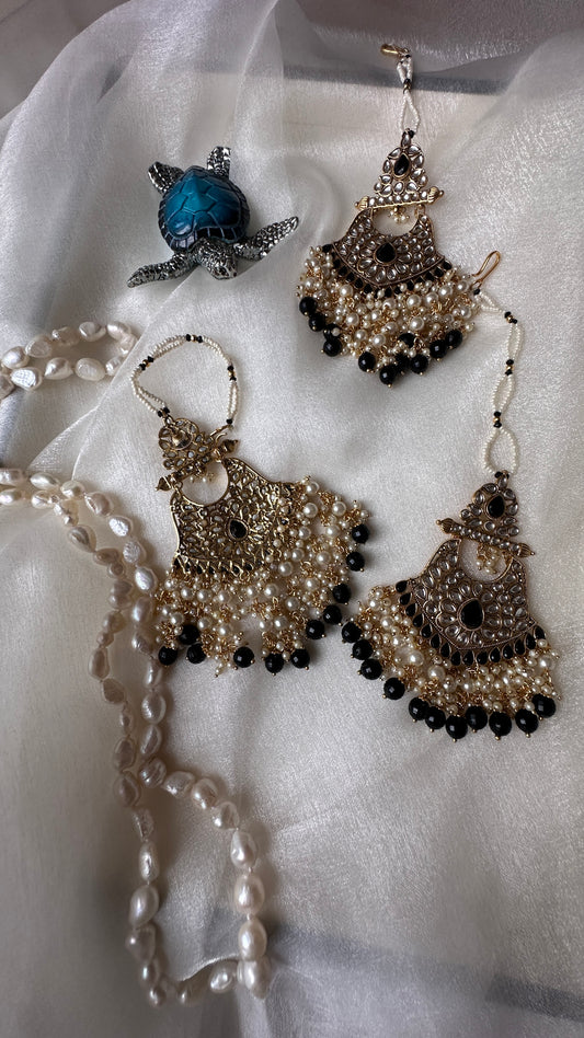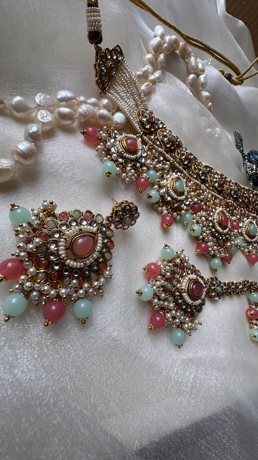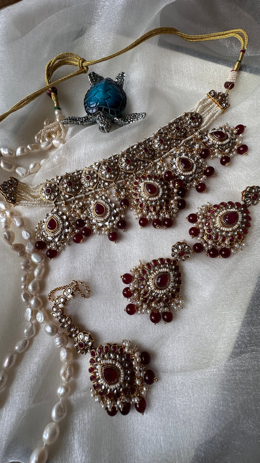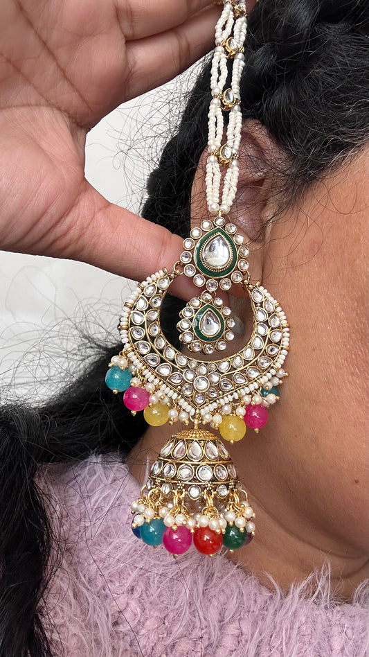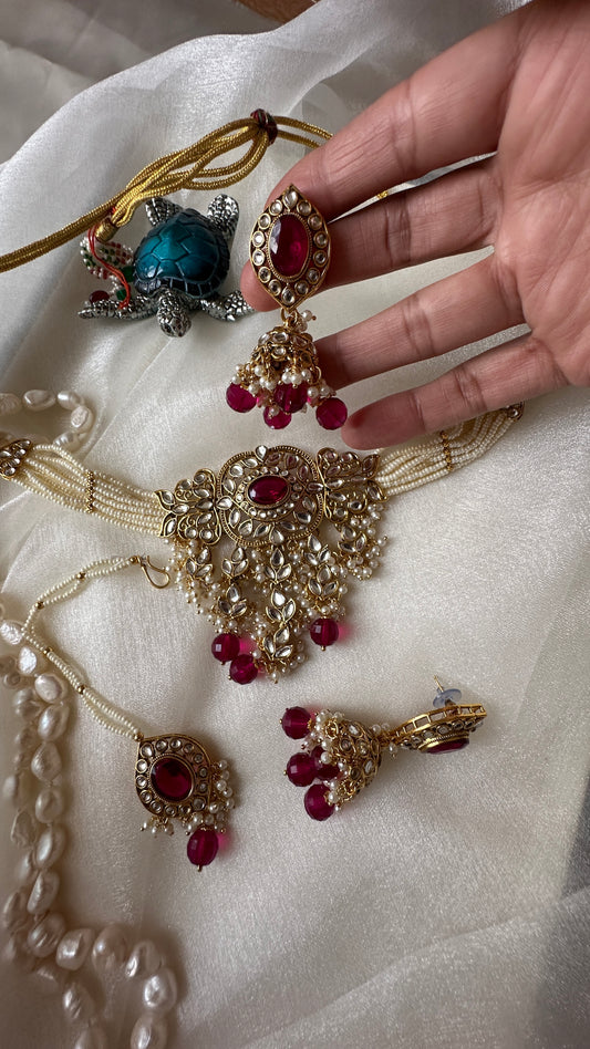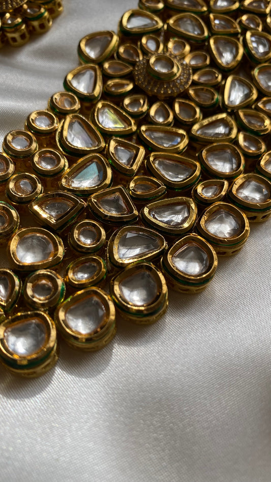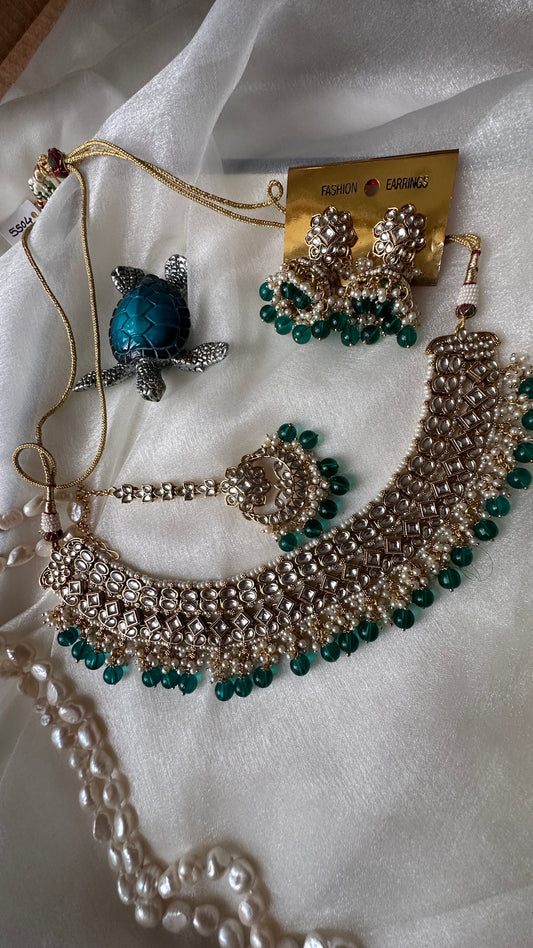 Kundan choker or necklace set with earrings and tikka mehndi green
