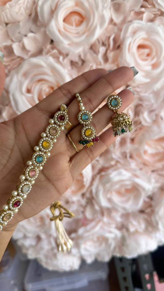Gold Plated Indian Choker Set with Earrings and tikka Sandookh collection