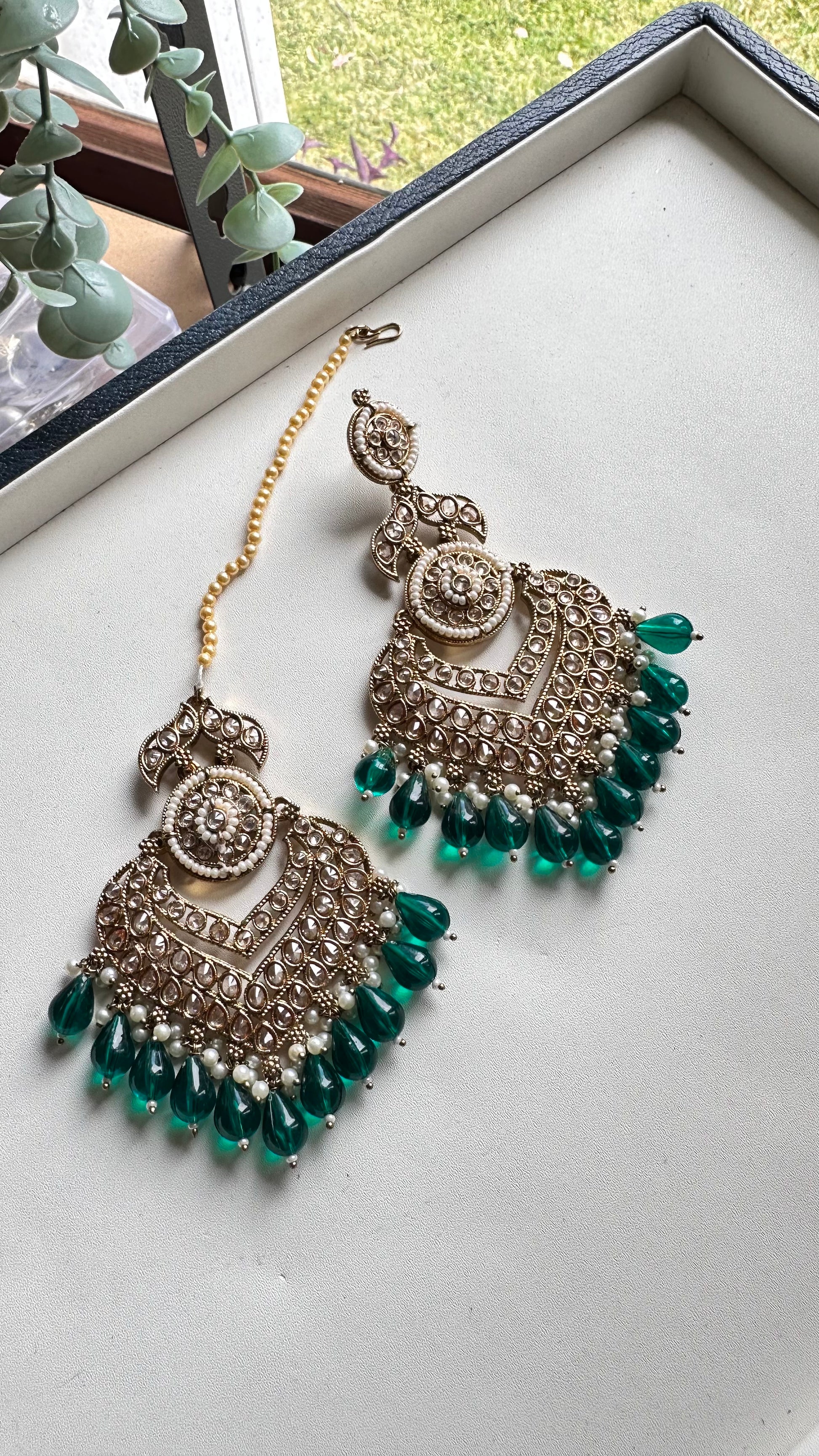 Green polki earrings and tikka